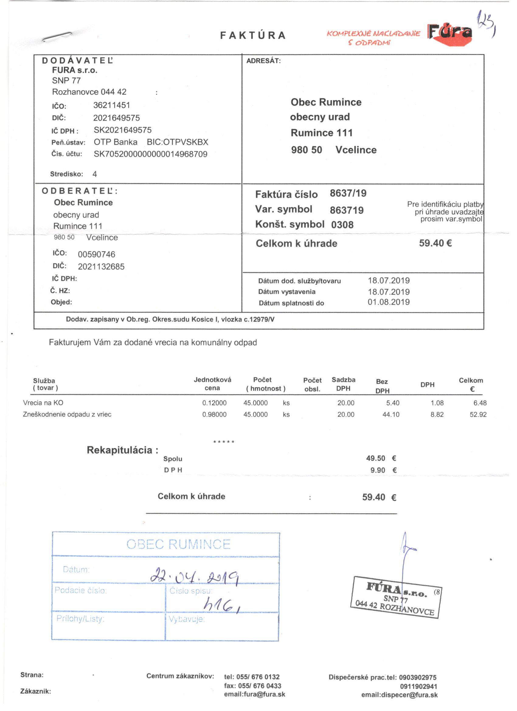 Výpočet vytriedenia komunálnych odpadov Obec Rumince |