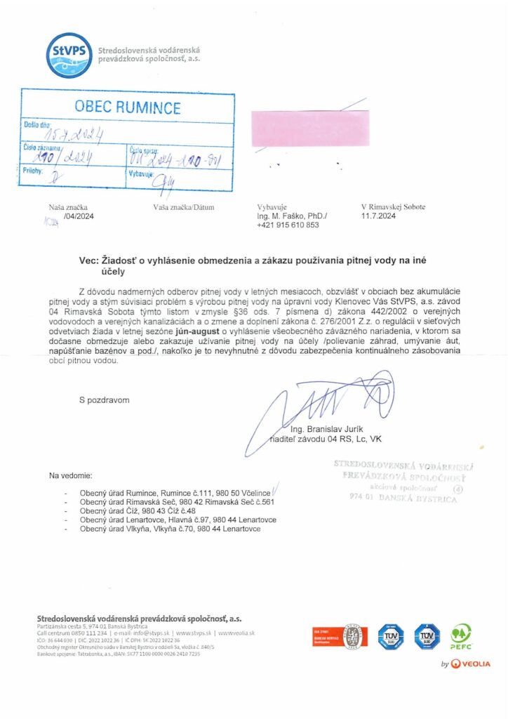 Žiadosť o vyhlásenie obmedzenia a zákazu používania pitnej vody na iné účely