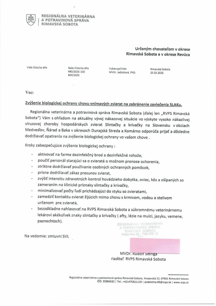 Zvýšenie biologickej ochrany chovu vnímavých zvierat na zabránenie zavlečenia SLAKu.